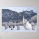 funny hybrids between penguins and elephants having fun on a nice winter day, playing in the snow - one got stuck in a huge snow ball. background shows Unken in Salzburg, Austria