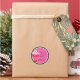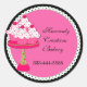 Pretty round stickers done in a black and pink pink background, with a decorative white scalloped frame. Colourful graphics of a cake stand full of cupcakes, decorate this too sweet bakery sticker. Text in black is ready to customize for your business. Great for bakeries, home bakers, and cake decorators, to use as seals to cake boxes and other packaging. Personalize for your business.