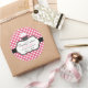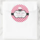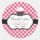 Sweet bakery box sticker done in pink with white polka dots. Graphics of a black and white decorative framed text area, has a pretty cupcake decorating the left side. Personalize all the text for your bakery business. Matching business cards available.
