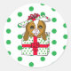 Sweet  hand drawn cartoon puppy dog in Christmas Gift Box with green polka dots whimsical  Merry Christmas to you Round Sticker  . These are so adorable to stick onto Christmas cards or candy favour bags.