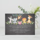Watercolor jungle animals baby shower invitation for a baby girl set on a modern black chalkboard background. Flip our invite over to view a coordinating pink damask pattern back.