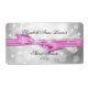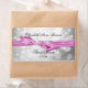 Sweet Sixteen, silver bokeh background Water Bottle Labels. Elegant pink silk look ribbon is accented with a beautiful pink faux shining gem. Personalize to create your perfect label. Change text to read Bat Mitzvah or Quinceanera.
