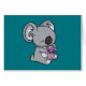 A grey koala cuddling a pink stuffed puppy dog toy.