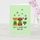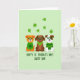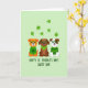 This card features a pale green background that sets a calm St. Patrick’s Day scene, with three stylized dogs lined up along the lower third like close friends posing for a photo 💚. The left dog has orange fur and wears a green sweater with a shamrock on the chest, leaning slightly toward the others with a wide, friendly grin. In the middle, a brown dog in a green bandana looks side to side as if sharing an inside joke, and all three wear round green glasses that make their smiles feel even more affectionate ☘️. On the right, a white-and-brown dog wears a green-and-white striped top, standing close enough that the trio reads as a sweet, together-at-heart group. Across the upper area, darker green shamrocks drift downward in a loose cascade, adding movement above their heads. The message “HAPPY ST. PATRICK’S DAY! SWEET SON” sits above the dogs in dark green, uppercase lettering, centered and easy to spot. The shamrocks vary in size and spacing as they fall against the soft green background.