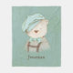 Sweet fleece blanket with lovable teddy bear in cute overalls and adorable hat. Personalize with your desired name choice. This will look so perfect in your little boys nursery or bedroom. Snuggle up with this little brown bear.