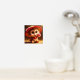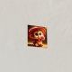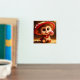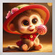 This image shows an adorable baby monkey wearing a red straw hat with pink flowers. The monkey has large, expressive eyes and a sweet smile as it holds a red and white lollipop. It is dressed in a red dress with a white button. The monkey is sitting on a wooden surface.
