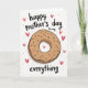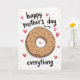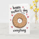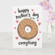 On the front of the card a large ring-shaped pastry sits centered on a white background, drawn in warm golden-brown tones with light cross-hatching that gives it a cozy, shared-treat feel ❤️. Dark, elongated sprinkles and a few scattered teal and brown dots decorate the surface, like little sweet details meant to be noticed up close. A soft gray shadow beneath the pastry adds depth, making it look gently set down for someone special. Above the pastry, small curved text in dark ink reads “happy mother’s day to my,” placed in a smooth, casual hand-lettered style. Below, the word “everything” appears larger and centered, also in dark ink, anchoring the layout. Around the pastry, several small coral-pink hearts float like affectionate glances, adding a friendly, loving energy 🌼. One brighter heart sits inside the pastry’s center opening, framed by the golden ring and surrounded by the white space.
