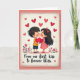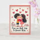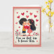 This greeting card shows a boy and a girl leaning in for a gentle kiss with their eyes closed and rosy cheeks. Between them, they hold a bright red heart, making the moment feel close and caring ❤️. The background is soft and light, with creamy tones and blush pink that keep the focus on the couple. Red hearts float around them in different sizes, like their affection is filling the air. The girl wears a red polka-dot dress and a matching red bow in her dark hair, and both characters have calm, content expressions. Near their feet, small red flowers and green leaves add a simple outdoor touch, and the whole picture sits inside a light stitched-looking border. At the bottom, the words “From our first kiss to forever bliss” appear in red cursive-style lettering, centered under the illustration. It feels meaningful to give because it says love can be sweet, steady, and lasting, and it’s a gentle way to share Valentine’s Day sentiments 🥰.