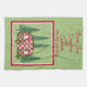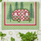 A sweet red and white checked vintage camper trailer, decorated for the holidays, with pine trees on both sides. One pine tree has a bright red cardinal bird perched on top. The background is cheerful sage green with white polka dots. This unique festive kitchen towel has a template for a name or other text of your choice. Below the name template, text reads: Campfires and Cocktails are my specialty. All the text on this useful towel is easily customized, so you are able to create the perfect gift for someone special.