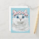This design features a pretty white kitten wearing a pink and blue flower halo.