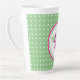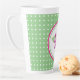 Designer latte mug in green with white polka-dot pattern, and a large single pink flower bloom, text can be added to personalize. The soft green background can be switched to any colour, as well as the large circle frames.