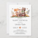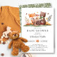 This cute baby shower invitation features adorable watercolor woodland animals - a fox, bunny rabbit, owl, and bear - with a tree log. The invitation is set on a simple white background with the date, time, and location of the baby shower in a tasteful font. The adorable watercolor woodland animals and tree and leaves add a touch of whimsy and fun, and the overall design is perfect for celebrating the upcoming arrival of your little one with your loved ones in a rustic and enchanting way.