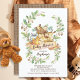 Cute watercolor woodland baby shower featuring adorable forest animals, bear, owl, raccoon, fox, bunny & deer with pine branches with pinecones with a brown burlap background. Perfect for a boys baby shower or gender neutral baby shower