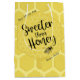What's sweeter than honey? God’s words! This yellow and black design was inspired by Psalm 119:103. Honey drips from the hexagon honeycomb with a honey bee nestled under the text which reads "Your Words Are Sweeter than Honey." Honeycomb covers all four sides of the gift bag.