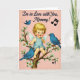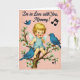 This card features a vintage-style illustration of a winged baby with golden curls, bright blue eyes, and rosy cheeks, seated on a twisting branch dotted with white blossoms and green leaves. The baby wears a pale blue one-piece outfit and smiles as if sharing a secret with someone close, adding a gentle, affectionate tone ❤️. Three small blue birds gather nearby—two perched on the branch and one gliding above—leaning in as though they’re joining the baby’s message like close friends. The background is a soft dusty-rose color that keeps the scene calm and tender. Near the upper area, the text reads “I’m in Love with You, Mommy!” in a flowing dark ink that stands out clearly against the pink. A couple of tiny musical notes sit beside the words, suggesting a sweet little tune 🌼. The branch curves across the lower half of the design, with clusters of white petals and leaves framing the baby and birds.