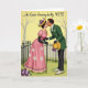 This design shows a vintage-style illustration of a fashionable couple leaning in for a kiss in a springtime garden, their faces close with a tender, romantic focus. The woman wears a flowing pink gown with small white floral details and gold edging, plus black gloves and a sunny yellow hat topped with purple-and-white flowers. Her partner bends toward her in a deep green suit with a white bow tie and dark trousers, holding a matching yellow hat decorated with similar blossoms, as if pausing mid-courtship. Behind them, a pale golden sky glows above thin, dark tree branches and a delicate black iron fence, framing the pair like a quiet stage. Underfoot, a bright green lawn is sprinkled with purple and white blooms that echo the flowers on their hats, adding a gentle 🌷 touch. The greeting appears near the top in a soft, dark font, sitting clearly against the light sky without crowding the artwork. Color accents of pink, green, yellow, and purple guide your eye from their clasped posture to the surrounding garden details, creating a feeling of closeness without needing extra words. A slim black fence line runs horizontally behind them, with bare branches reaching upward like fine ink strokes 🐇.