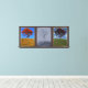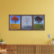 A 3D landscape created in Vue, showing the same tree on a hill in autumn, winter, and spring or summer, each season framed in gold or silver.