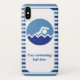 Swimming gifts, swimmer on a blue circle modern iPhone X case design displaying a minimalist white icon of a swimmer on a two tone blue circle-sea and sky and around it a two tone blue border with stripes.