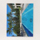 Jigsaw puzzle. A pristine swimming pool with decorative patterns on the bottom is surrounded by lounge chairs and palm trees. The clear blue sky and lush greenery create a relaxing, tropical atmosphere.