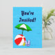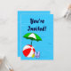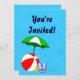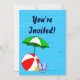 Custom party invitations with a fun swimming pool theme, decorated with a red beach ball, green umbrella, sandals and suntan oil on a watery blue background with curly waves. Click Customize It to change fonts or colours.