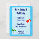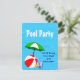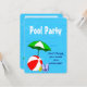 Custom party invitations with a fun swimming pool theme, decorated with a red beach ball, green umbrella, sandals and suntan oil on a watery blue background with curly waves. Customize it to change fonts or colours, even save your design for later.