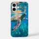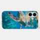 Underwater photograph of a sea turtle swimming in crystal clear water just below the surface.