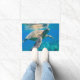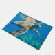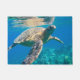 Underwater photograph of a sea turtle swimming in crystal clear water just below the surface.