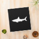 The silhouette of a swimming shark in black and white designs.