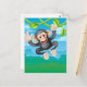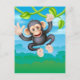 A cute cartoon chimp primate, similar in appearance to a monkey, character swinging from vines in the trees of a jungle and waving