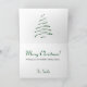 Wish your friends and family Merry Christmas with this graceful, elegant Christmas greeting card. A glowing Christmas tree made of white ribbon swirls rests on a festive green background. Whether you're sending cards to friends, family, or coworkers, these seasons greetings will always have a warm winter welcome. Don't forget matching postage!