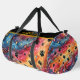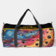 This colourful pattern duffle bag features a mesmerizing swirling cosmic design in vibrant hues, liberally accented with classic black paw prints and twinkling stars. It's a unique and stylish pet accessory, perfect as a travel storage carrier for any pet lover.