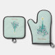 This oven mitt and pot holder set with an original digital painting by Leslie Sigal Javorek of a swirly turquoise Christmas tree w/ violet ornaments on a Trompe L'oeil (trick of the eye) background illusion of fine bone china & greater depth.