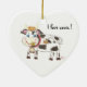 A fun ceramic heart-shaped Christmas ornament with the illustration of a white and black Swiss cow wearing a Swiss cow bell around her neck and chewing on a yellow wild flower . It also has the words "I love cows !" on the upper right hand side :) © ArianeC Illustrations