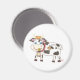 A round refrigerator magnet with the illustration of a white and black Swiss cow wearing a Swiss cow bell around her neck and chewing on a yellow wild flower . © ArianeC Illustrations