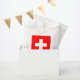 This design features the flag of Switzerland (officially the Swiss Confederation), which is a landlocked country in the middle of Europe. It is a federal republic, divided into 26 cantons; its capital city is Bern, while its largest city is Zurich. The country borders Germany to the north, Austria and Lichtenstein to the east, Italy to the south and France to the west. While most of the landmass is made up of the Alps, most of Swiss population lives on the plateau, where most major cities and economic centres are located, such as Zürich, Geneva and Basel. Switzerland has four official languages: German, French, Italian and Romansh, a less commonly spoken Romance language that is native to the country. The emblem of the Red Cross is the Swiss flag with switched colours.