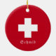 Show your love for your Swiss heritage with a piece of Switzerland. The alpine Edelweiss and white cross decorate this red ornament. Simply customize with your family name, year and greeting. Great family ornament can also double as a gift tag! Get one for each member of the family as an annual remembrance. Decorate your tree and let the edelweiss symbolize your connection to your love of Switzerland.