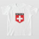 The national flag of Switzerland is infused into a shield shape that also has the country name set above the flag.