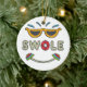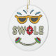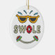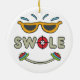 Swole bodybuilding design features some sweat above a pair of shades, the word "Swole" with the "o" as a target, and a smile made from a set of weights. A fun design for lifting and bulking fans.