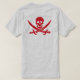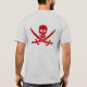 The iconic Jolly Roger pirate flag symbol with crossed swords - full size on the back and repeated on the front "pocket". In red on any background you choose!