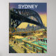 Travel poster print of Sydney Harbour Bridge and Sydney Harbour with North Sydney pools in an arty modern colourful style of travel art print. Blue sky and people swimming on a hot Summer's day in the city of Sydney, Australia.