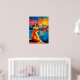 Warm Sydney teddy golden harbor artwork featuring a contemplative teddy bear silhouette overlooking the Opera House and Harbour Bridge at sunset. Bold fauvist colors and crisp segmented reflections create vibrant wall art perfect for australia lovers, nursery decor, and modern interiors.