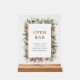 Signe Acrylique à barre ouverte d'hiver. Guidez vos invités au bar avec notre panneau en acrylique à barre ouverte, partie de la "Elegant Winter Pinecone Greenery Mariage Suite". Cette enseigne allie élégance moderne et beauté peinte à la main de la verdure et des pics de pin, assurant une atmosphère cohésive et accueillante pour votre célébration.