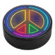 Graphic of a multicolored neon peace sign symbole against a brick wall background