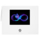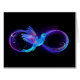 Glowing, purple infinity symbole with flying, luminous, blue hummingbird on black background. Néon.