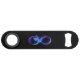 Glowing, purple infinity symbole with flying, luminous, blue hummingbird on black background. Néon.