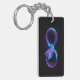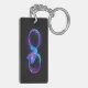 Glowing, purple infinity symbole with flying, luminous, blue hummingbird on black background. Néon.