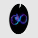 Glowing, purple infinity symbole with flying, luminous, blue hummingbird on black background. Néon.