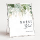 Nous avons conçu ce panneau de livres d'hôtes en feuilles d'or et de verdure pour compléter votre réception boho simple mais élégante. Il présente des feuilles modernes d'eucalyptus vert et blanc, du feuillage de fougères, une fleur succulente et un minimum de feuilles de feuille d'or. Ces éléments donnent l'impression d'une forêt enchantée d'aquarelle capricieuse, parfaite pour tout mariage bohème et rustique ! N'hésitez pas à vous customiser et à vous en servir, n'hésitez pas à consulter le reste de la collection pour trouver les produits correspondants et coordonnés !