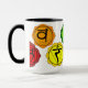 La tasse de café en verre blanche avec tout le reiki principal de yoga sept symboles de chakra a imprimé dessus dans le détail complet dans l'ordre de spectre de lumière visible utilisant la violette traversante rouge de représentation de couleurs de gauche à droite avec les étiquettes nommés colorés pour l'identification de symbole !