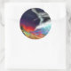 The flowing rainbow merging of land and sea from a larger, highly colourful artwork of two nature spirits - the Earth child, with her hair of flowers and plants, and gown of bright soil, flowing in rainbows into the bright blue ocean. The white spray of the cresting wave contrasts with the duller reds and purples of the setting sun.